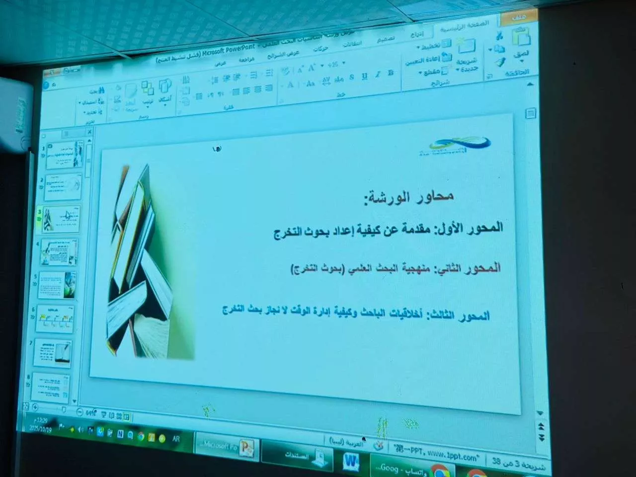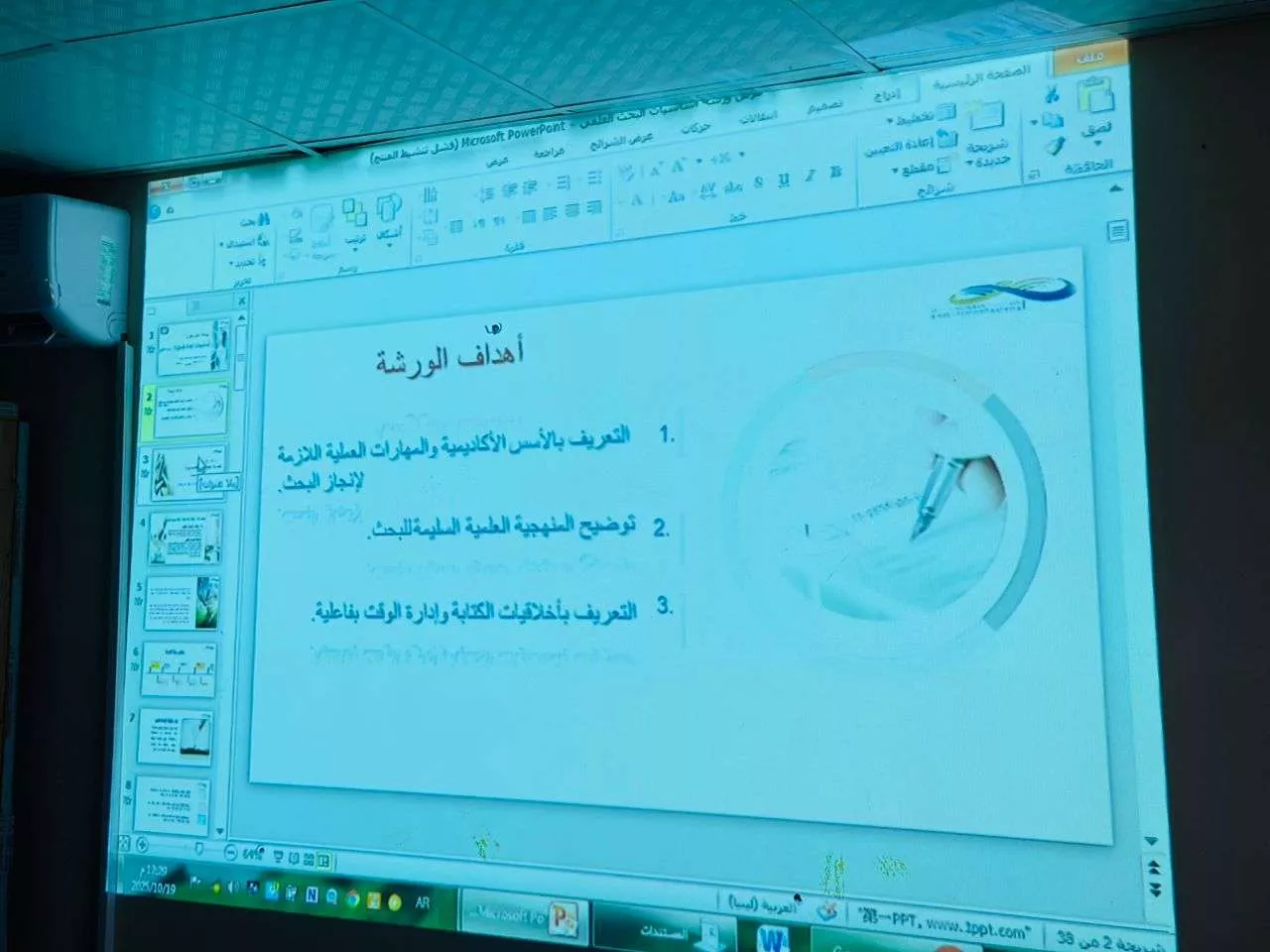 - وكان الهدف الرئيسي للورشة هو تعريف الطلبة الخرجين بكيفة إعداد بحوث التخرج بشكل أكاديمي وعلمي وإنجازها في الوقت المحدد .